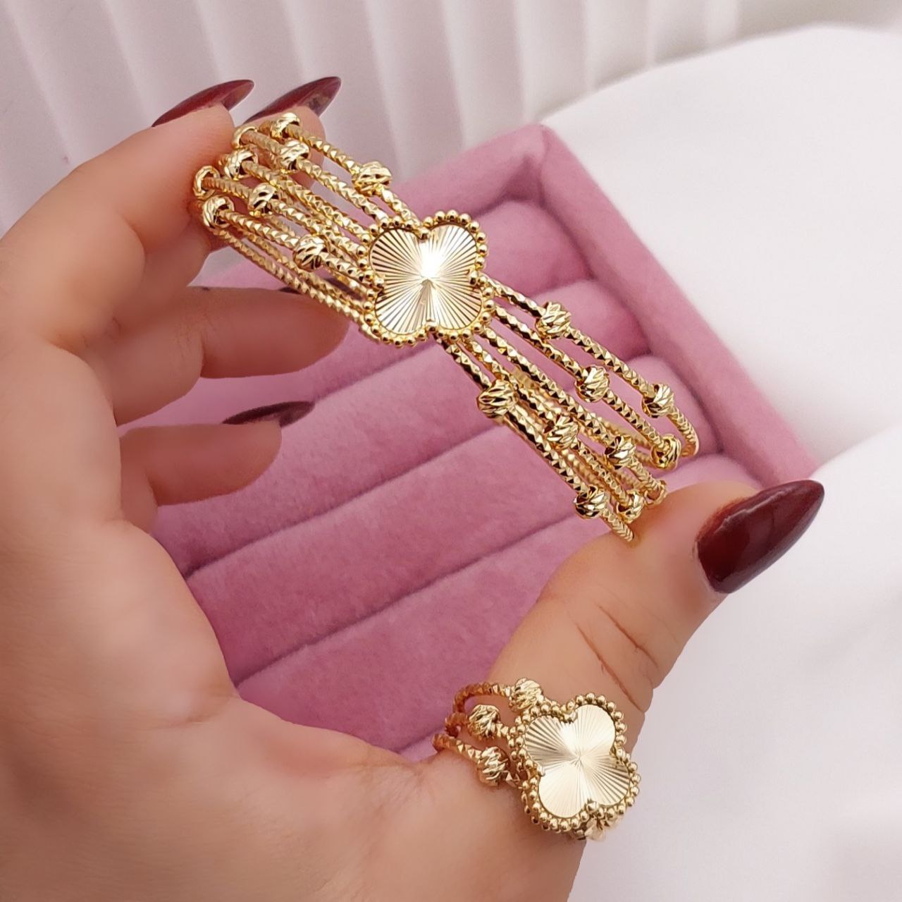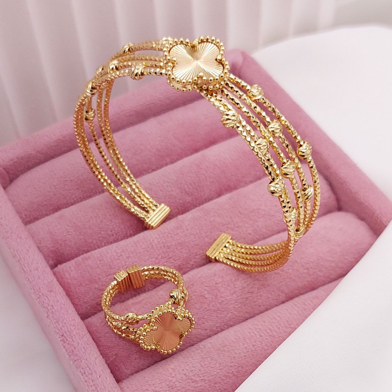#ست دستبند انگشتر ون_کلیف جدید😍😍 ♦️رنگ ثابت ♦️بدون حساسیت ♦️آبکاری طلا ♦️کاملا کپی شده از طلا ♦️سایزدستبند وانگشتر قابل تنظیم ✅️شارژ مجدد✅️