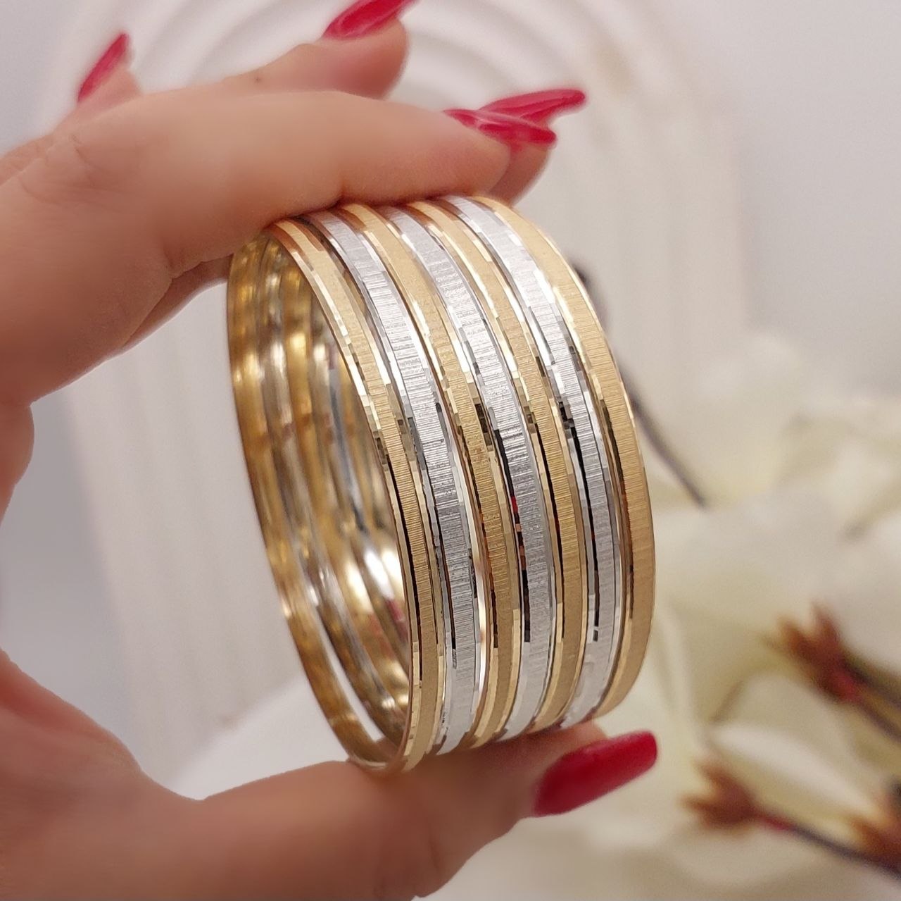 آبکاری با کیفیت طرح طلا روس، ظاهر نزدیک به طلا و درخشندگی بالا به این النگو میدهد و آن را به گزینهای مناسب برای استفاده مجلسی، مهمانیها و استایلهای خاص تبدیل میکند. اگر به دنبال النگویی متفاوت، خاص و ماندگار هستید، این مدل انتخابی جذاب خواهد بود.
