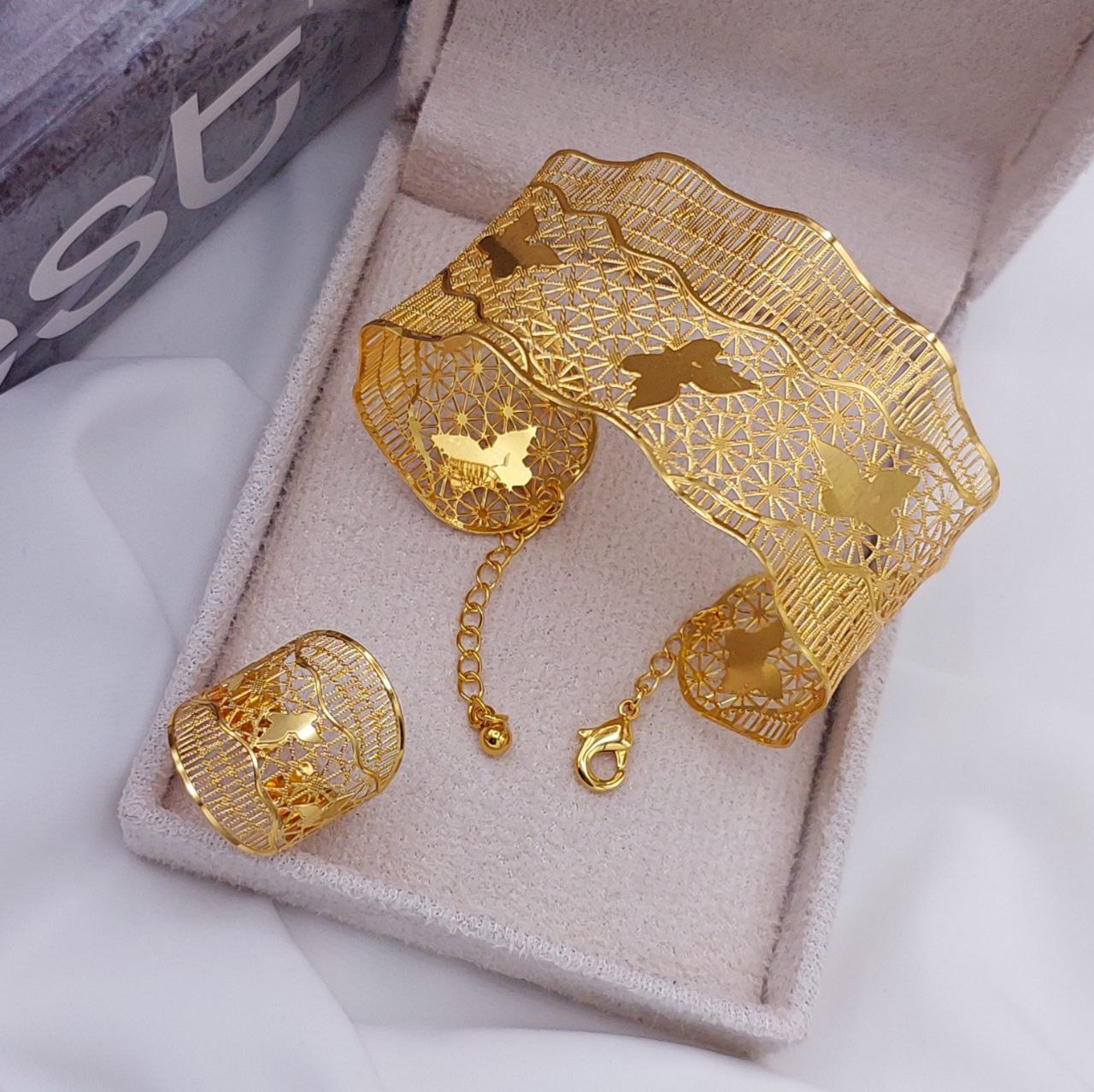 ست دستبند و انگشتر زنانه بحرینی مدرن با طراحی شیک و متعادل، گزینهای ایدهآل برای بانوانی است که به زیورآلات مجلسی اما سبکتر و قابل استفاده مکرر علاقه دارند. این مدل با حفظ جلوه طلایی، ظاهر مرتب و خوشفرمی روی دست ایجاد میکند.