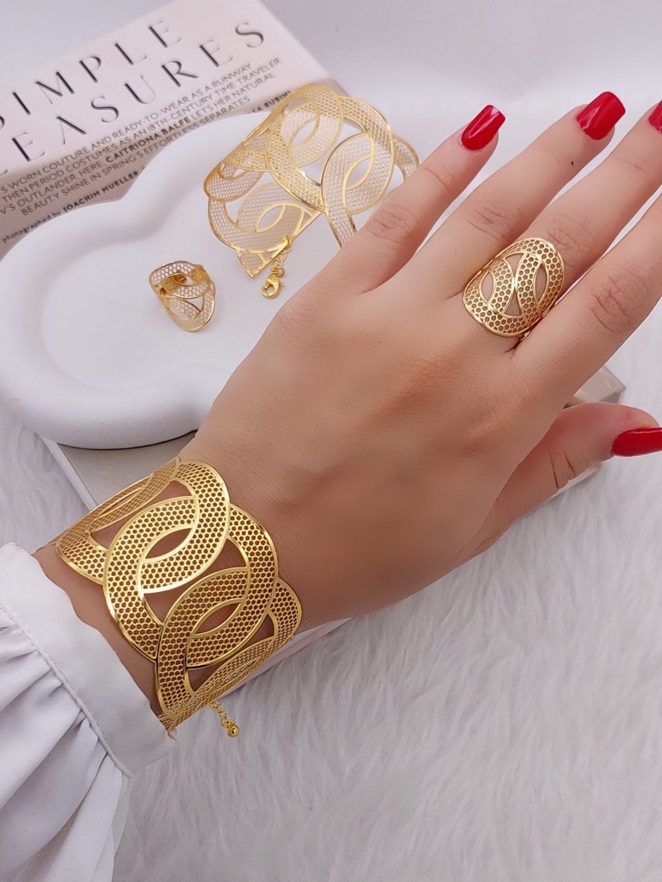 آبکاری طلای باکیفیت، رنگ ثابت و خاصیت ضد حساسیت باعث شده این ست برای استفاده طولانیمدت کاملاً مناسب باشد. طراحی فریسایز آن نیز امکان استفاده راحت برای انواع سایز دست را فراهم میکند.
