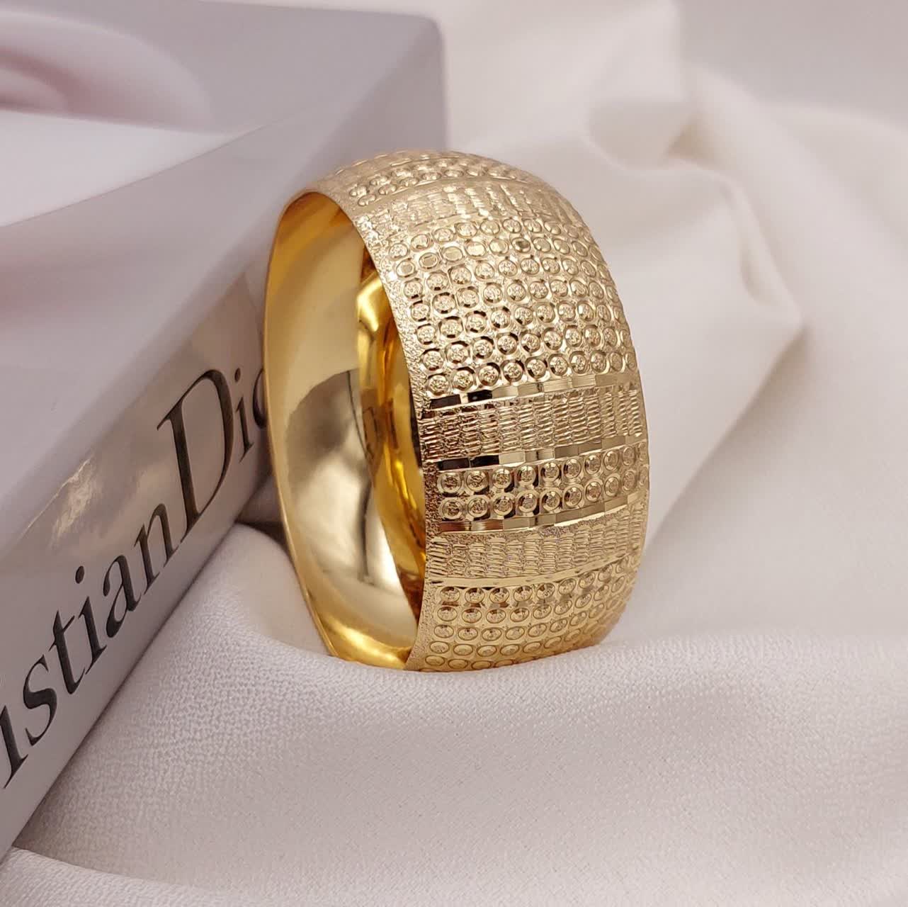 طراحی پهن و پرجزئیات این مدل، آن را به انتخابی عالی برای کسانی تبدیل کرده که به النگوهای خاص و چشمگیر علاقه دارند. استفاده از آبکاری باکیفیت طلا روس، ماندگاری رنگ و درخشش محصول را تضمین میکند.