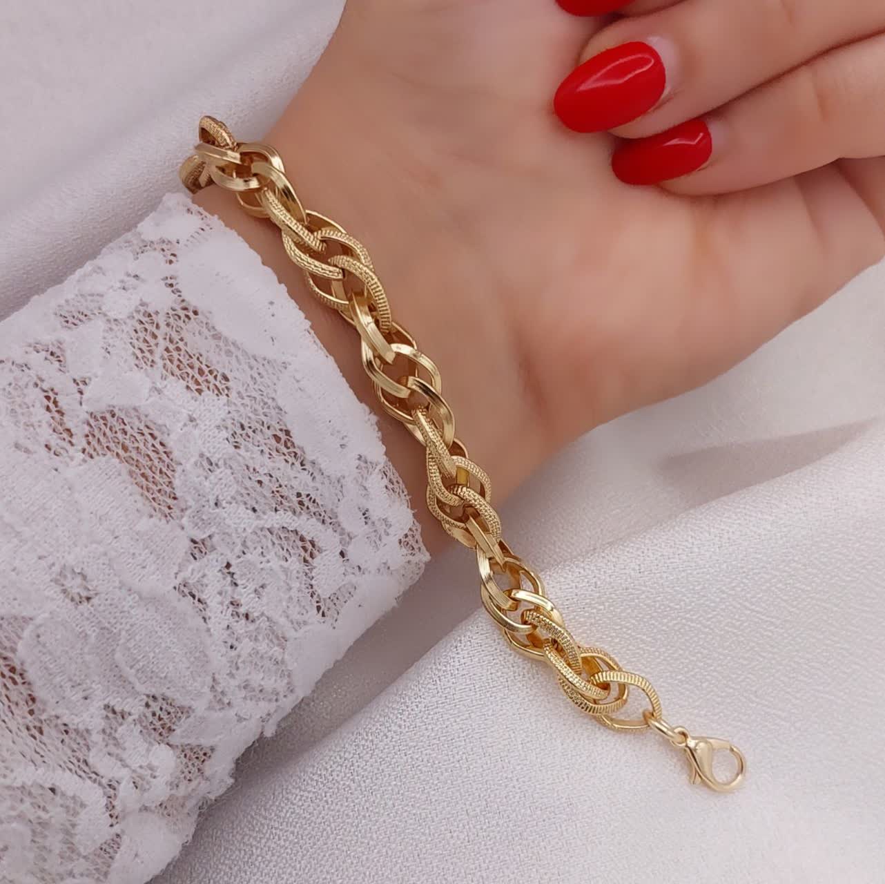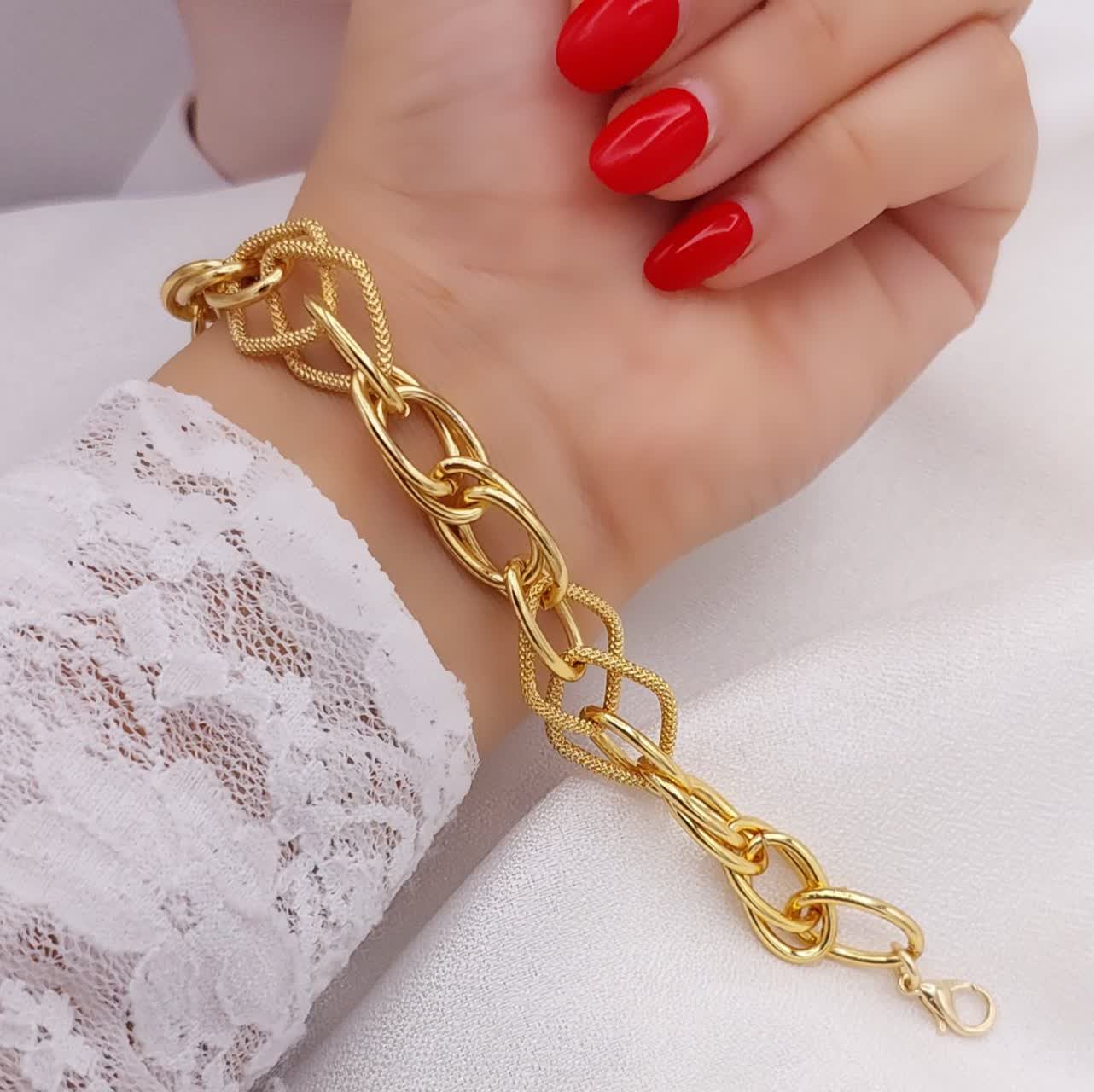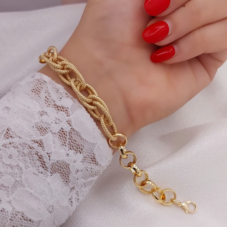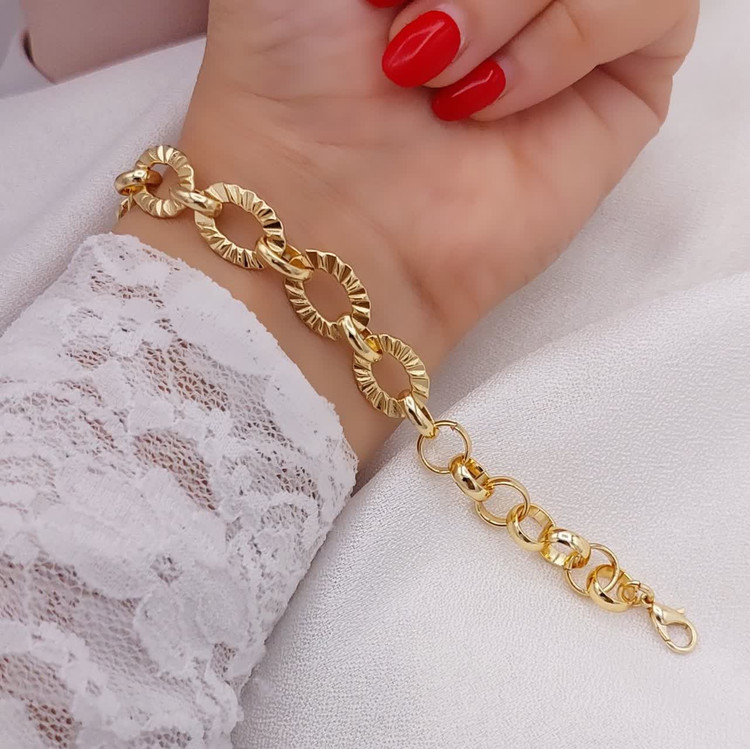 طراحی زنجیری با ۵ مدل بافت مختلف، این دستبند حلقهای زنانه را به یک انتخاب جذاب تبدیل کرده است. درخشش حلقهها بهگونهای است که در نور، ظاهری مشابه طلاهای ۲۴ عیار را در ذهن تداعی میکند.