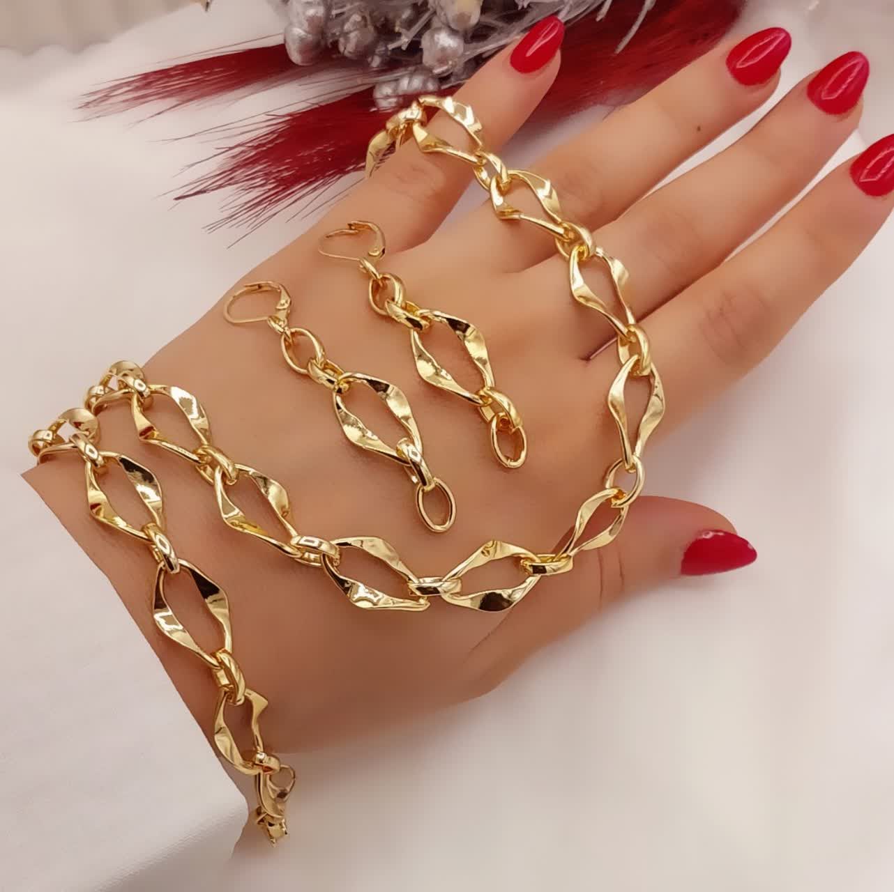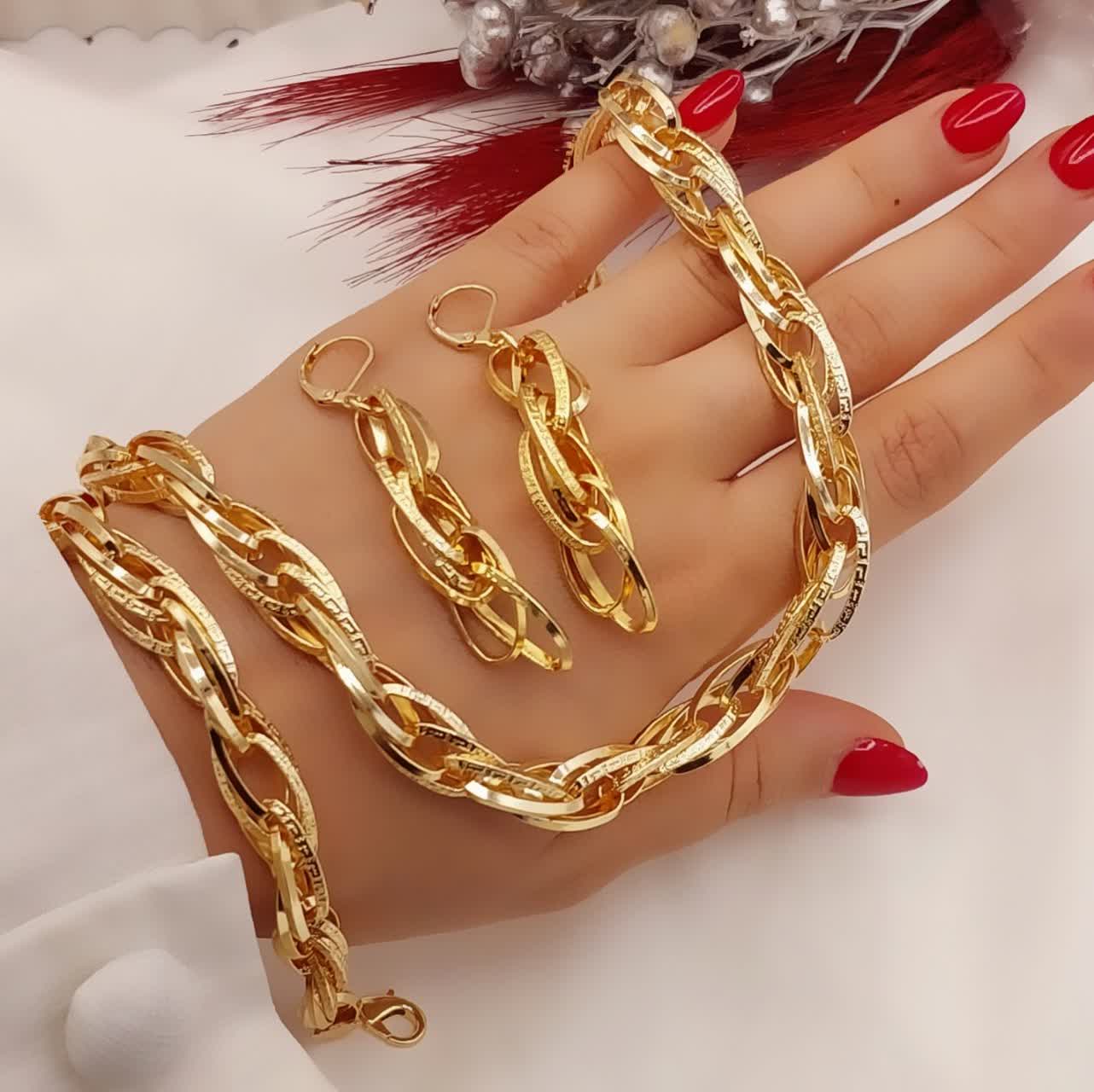 سرویس زنانه طرح طلا شین با طراحی زنجیری حلقهای و فرم درشت و براق، جلوهای لوکس و چشمگیر به استایل شما میدهد. هماهنگی کامل گردنبند، دستبند و گوشواره باعث میشود این ست جلوهای منظم و شبیه زیورآلات طلا داشته باشد.